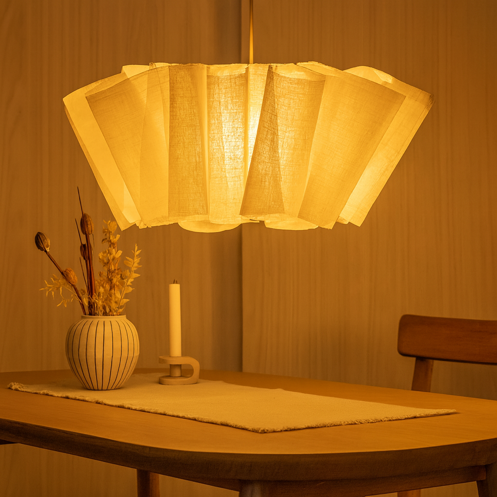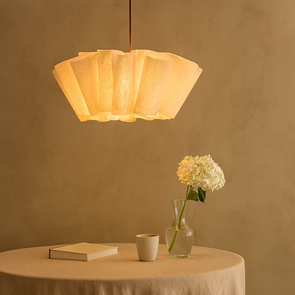Den håndlavede, minimalistiske Lumara pendellampe kombinerer funktionelt design med stilren belysning. Med sin stofskærm og rene silhuet giver den et blødt, atmosfærisk lys, der passer til stuer, spisestuer og soveværelser. Hver lampe er omhyggeligt fremstillet og forener tidløst håndværk med moderne formgivning.