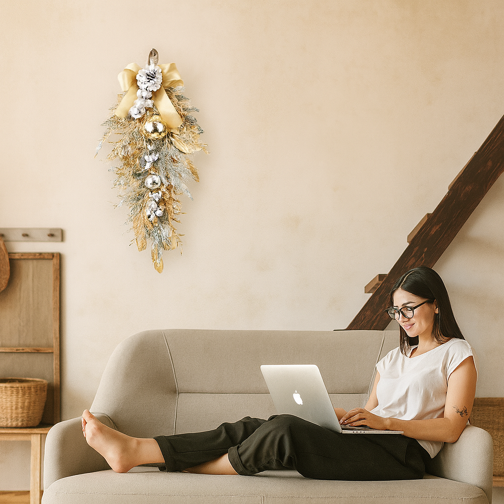 Byd julemagien velkommen ind i dit hjem med Noellea | Festive Drop Décor. Denne juledekoration forvandler øjeblikkeligt din hoveddør eller væg til et varmt og indbydende blikfang. Med sine elegante teksturer og funklende detaljer indfanger den julens sande essens og skaber en festlig atmosfære for dig og dine gæster.